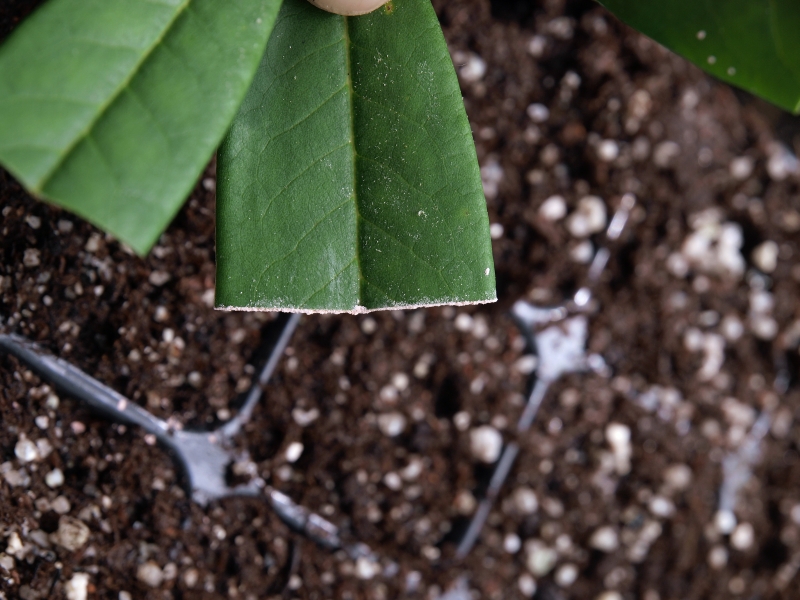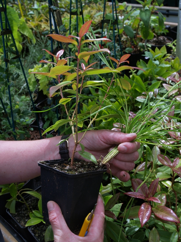 Preparing Rhododendrons – including trimming and dipping them in fungicide.