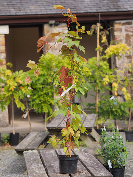 Large deeply cut, rounded leaves, purple when new and colouring red-orange in autumn
