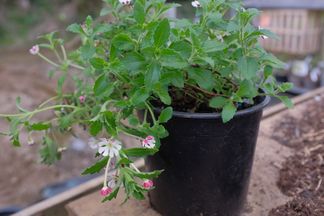 Crimson-backed white flowers which open in the evening and release a pleasant scent. Each petal is notched at the tip to give a 'whirligig' effect. Sticky, toothed, aromatic grey-green leaves
