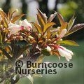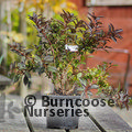 Purple-green leaves in spring turning an intense purple in summer. White flowers on purple-red stems contrast well with the leaves. Best colour in full sun. Compact