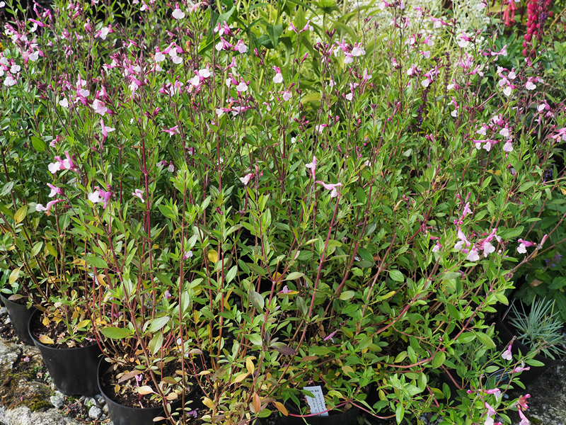 A bicoloured variety with white tinged pink flowers before a pinkish-red calyx