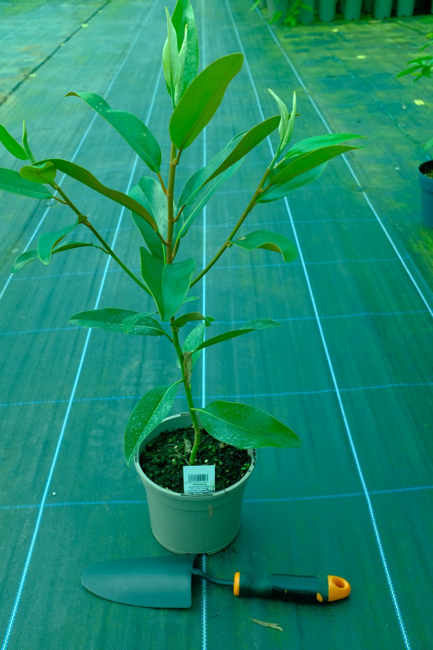 Very hardy variety. Columnar in habit. Dark green shiny leaves and rust coloured indumentum. White fragrant flowers