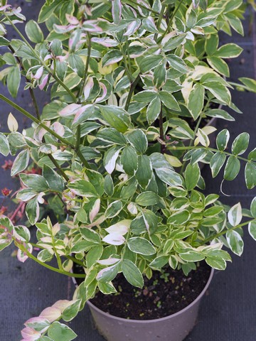 Variegated leaves, cream and green, flushed with pink in spring. Lightly fragrant pale blue flowers