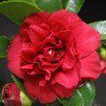 Japonica. Large semi-double scarlet with red and yellow stamens