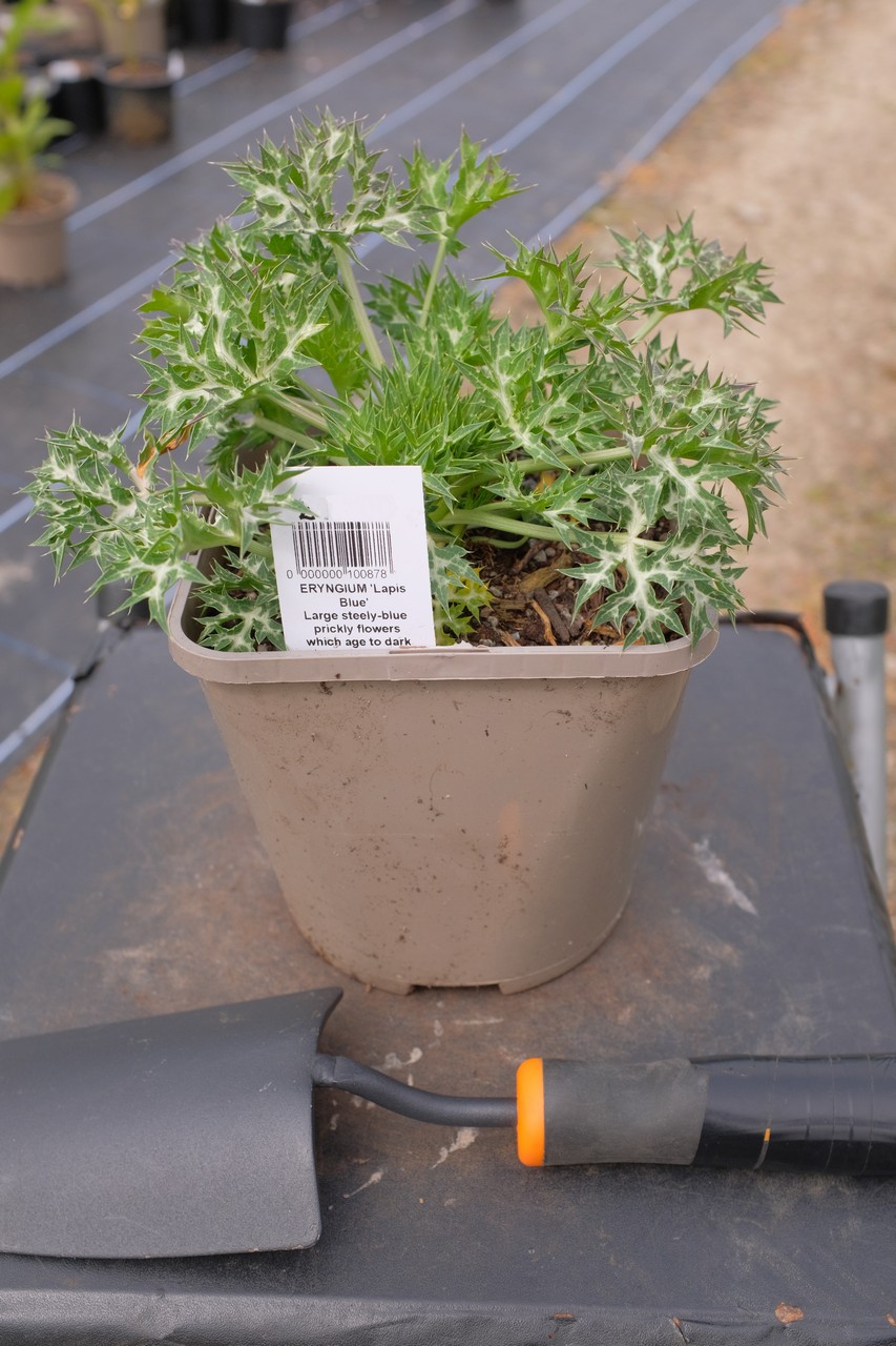 A compact sea-holly. Thistle-like plant ideal for a gravel bed. Wildlife plant - butterflies -