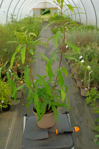 Upright shrub with lanceolate and toothed leaves. Fragrant white flowers