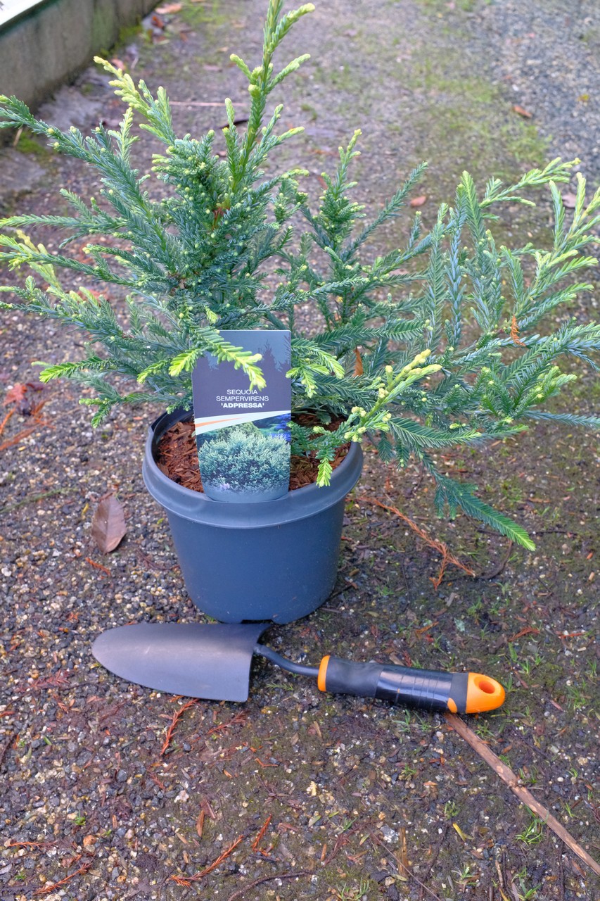 A form of redwood, which is slow-growing. New growth whitish cream before turning green later. Needles short, borne close against the stem.