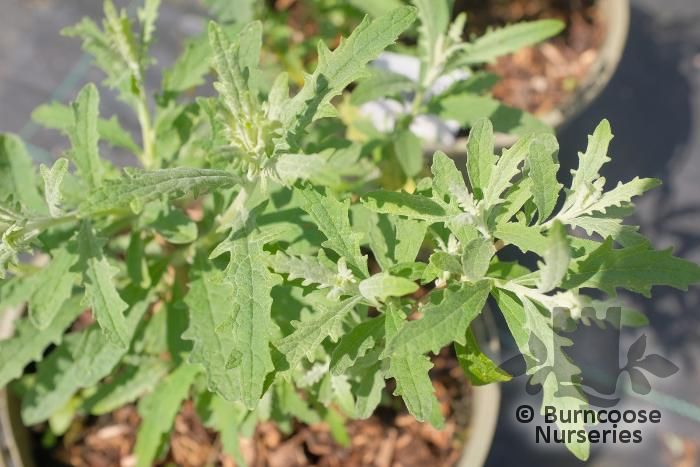 Narrow, grey, toothed leaves. Flowers of pale lilac with orange throat.