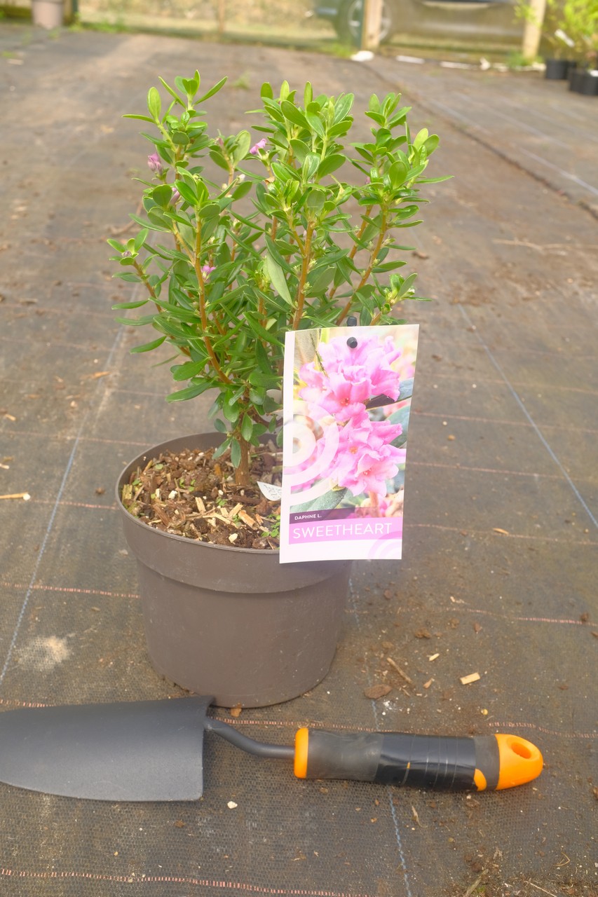This daphne flowers in spring and, again, in summer. Deep pink flowers in clusters with a sweet fragrance