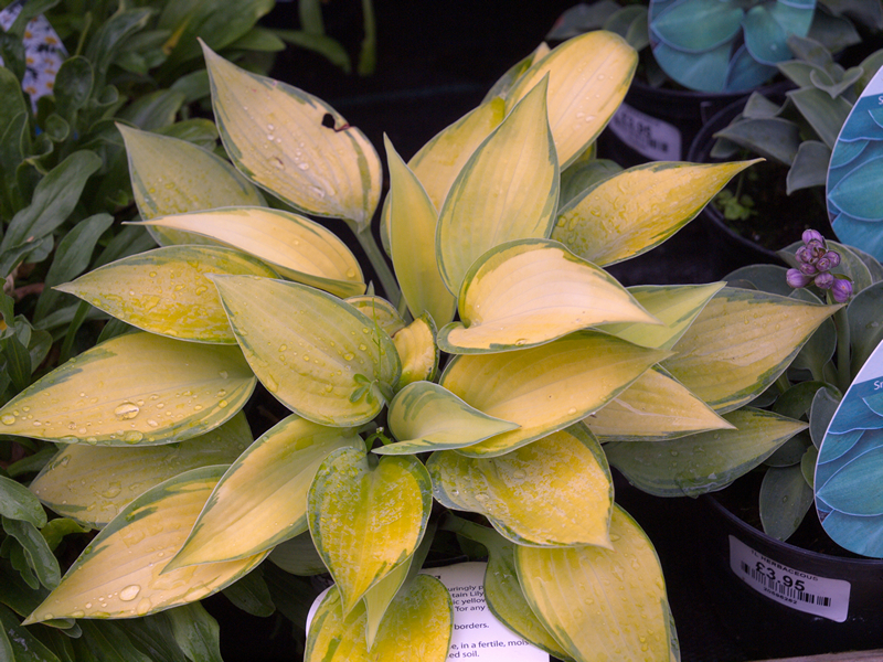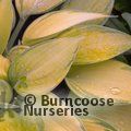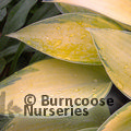 Green edged leaves with broad central yellow splash, with a hint of orange in spring. Matures almost white in summer